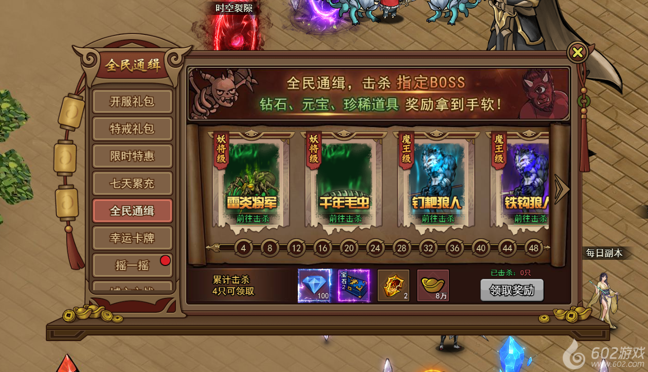 活动说明:全民通缉,击杀指定B0SS钻石、元宝、珍稀道具奖励拿到手软!