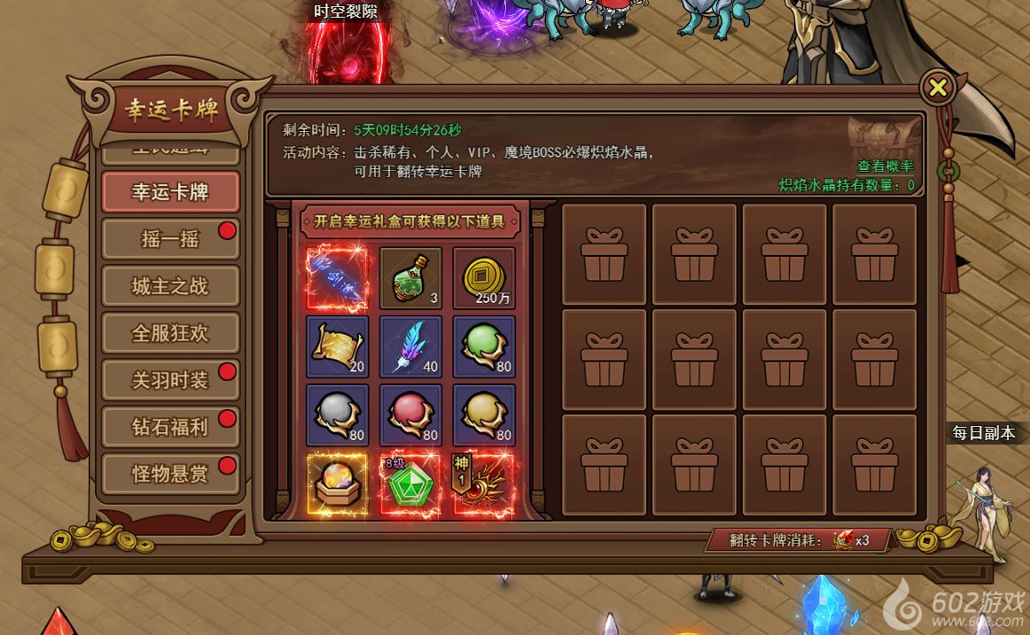 活动说明:击杀稀有、个人、VIP、魔境B0SS必爆炽焰水晶可用于翻转幸运卡牌