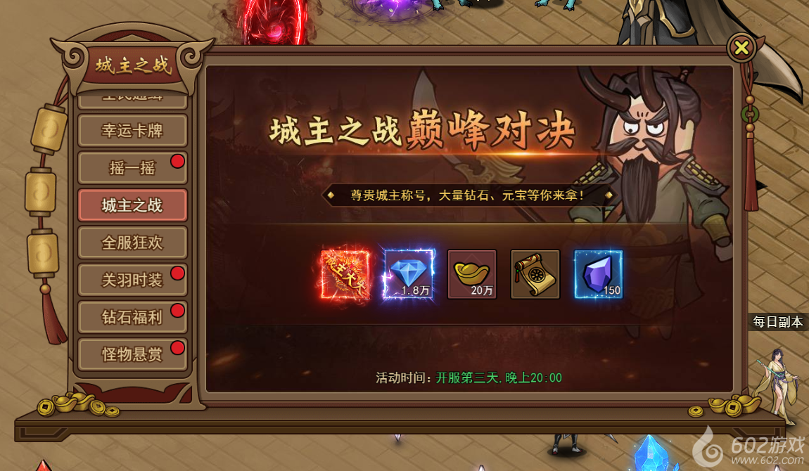 活动说明:城主之战巅峰对决,尊贵城主称号,大量钻石、元宝等你来拿!