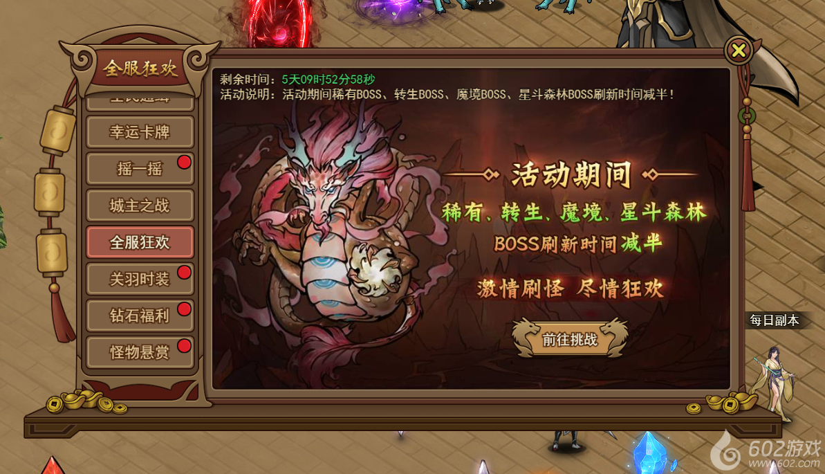 活动说明:活动期间稀B0SS、转B0SS、魔境B0SS、星斗森林B0SS刷新时间减半!