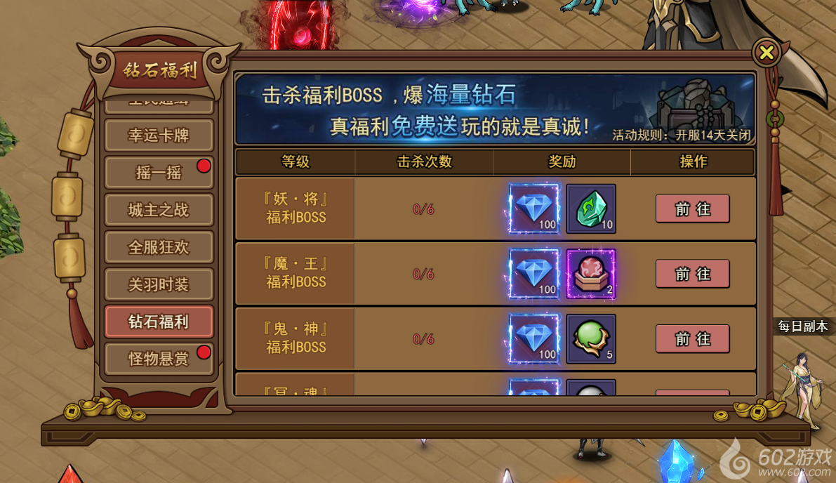 活动说明:击杀福利B0SS,爆海量钻石真福利免费送玩的就是真诚!