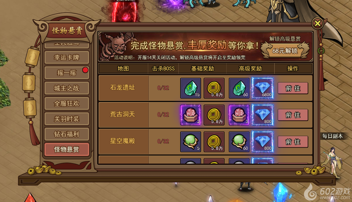 活动说明:开服14天关闭活动,解锁高级悬赏将开启至奖励领完